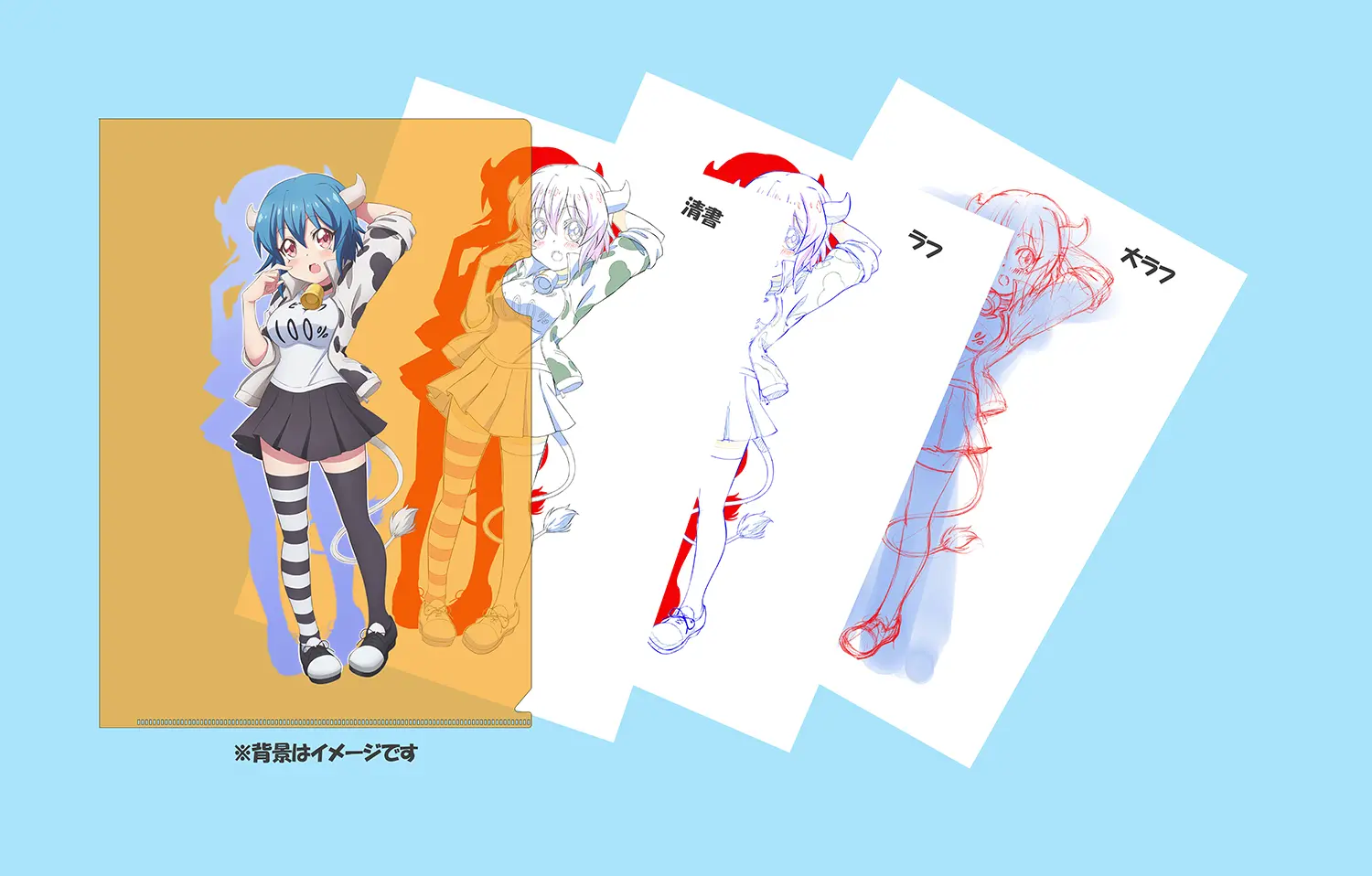 表には完全新規描き下ろしの、クリアファイルの中には描き下ろしの過程が確認できる「大ラフ」「ラフ」「清書」の3種の原画出力を封入致します!